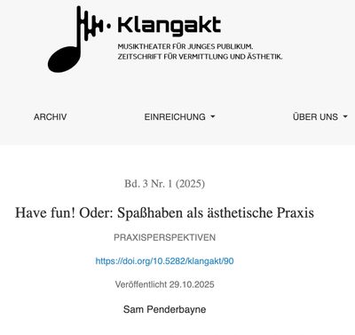 Penderbayne, Samuel: Have fun! Oder: Spaßhaben als ästhetische Praxis. In: Klangakt, Bd. 3, Nr. 1, 2025, DOI: 10.5282/klangakt/90